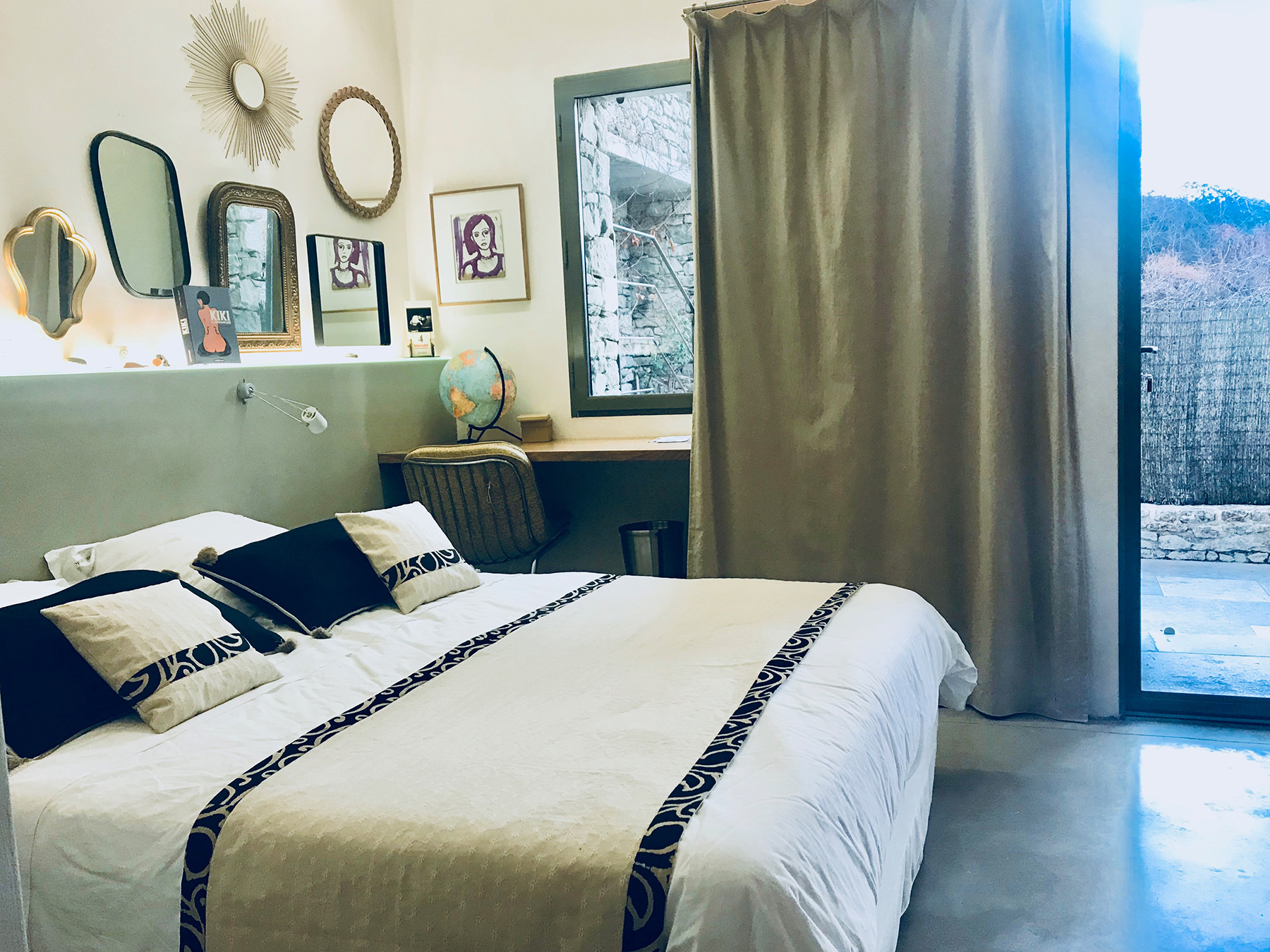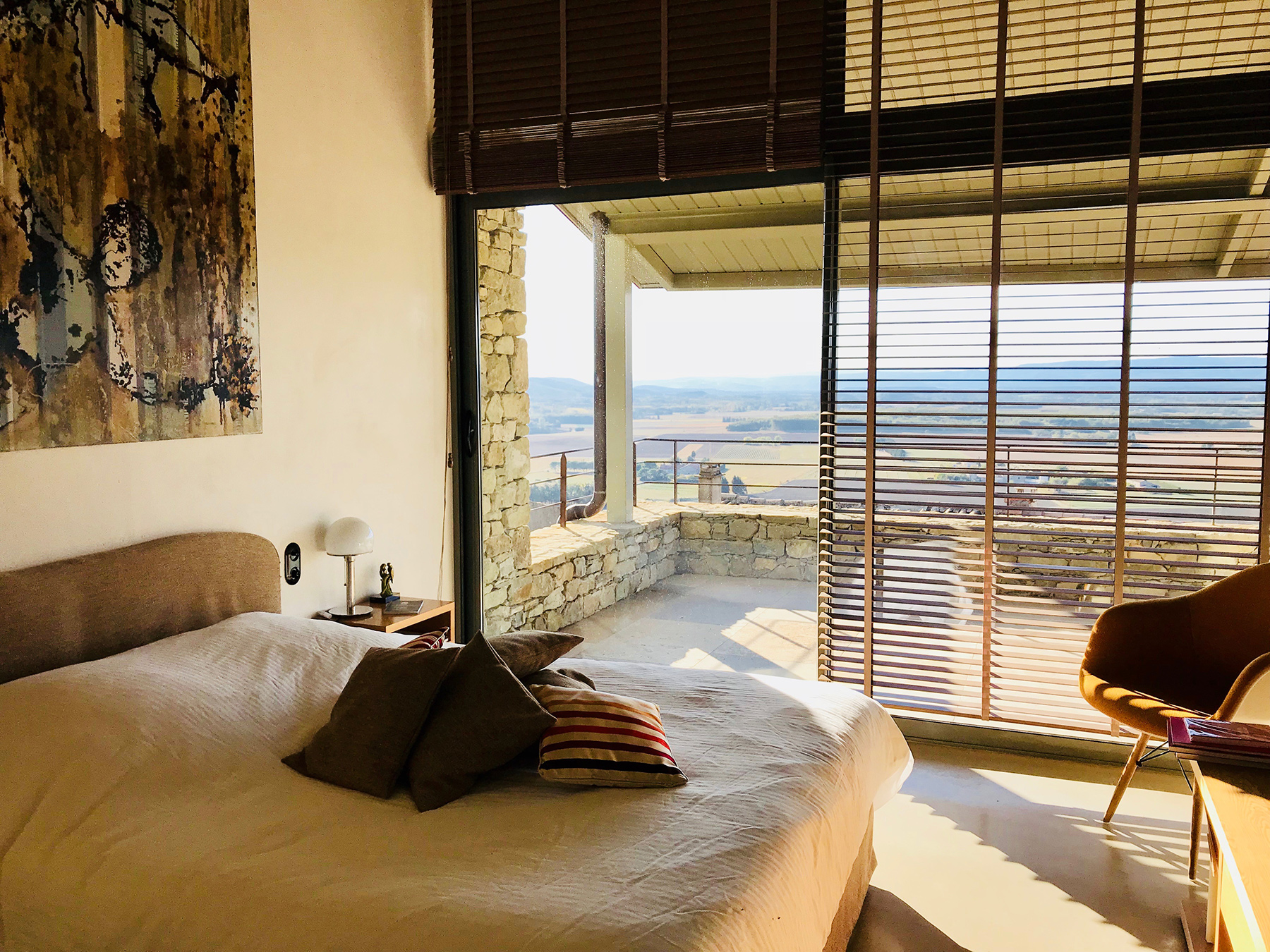 À flanc de colline d’un village médiéval, reconstruite sur « La Judicature », justice de paix au XIIe siècle, notre maison est un enclos totalement protégé à l’est, quand l’ouest ouvre à perte de vue sur la vallée du Rhône, les monts de l’Ardèche, les Cévennes. Si vous venez en Drôme provençale, vous ne recherchez pas un tourisme urbain, bien plus la Provence de la chanson “Route Nationale 7”.
